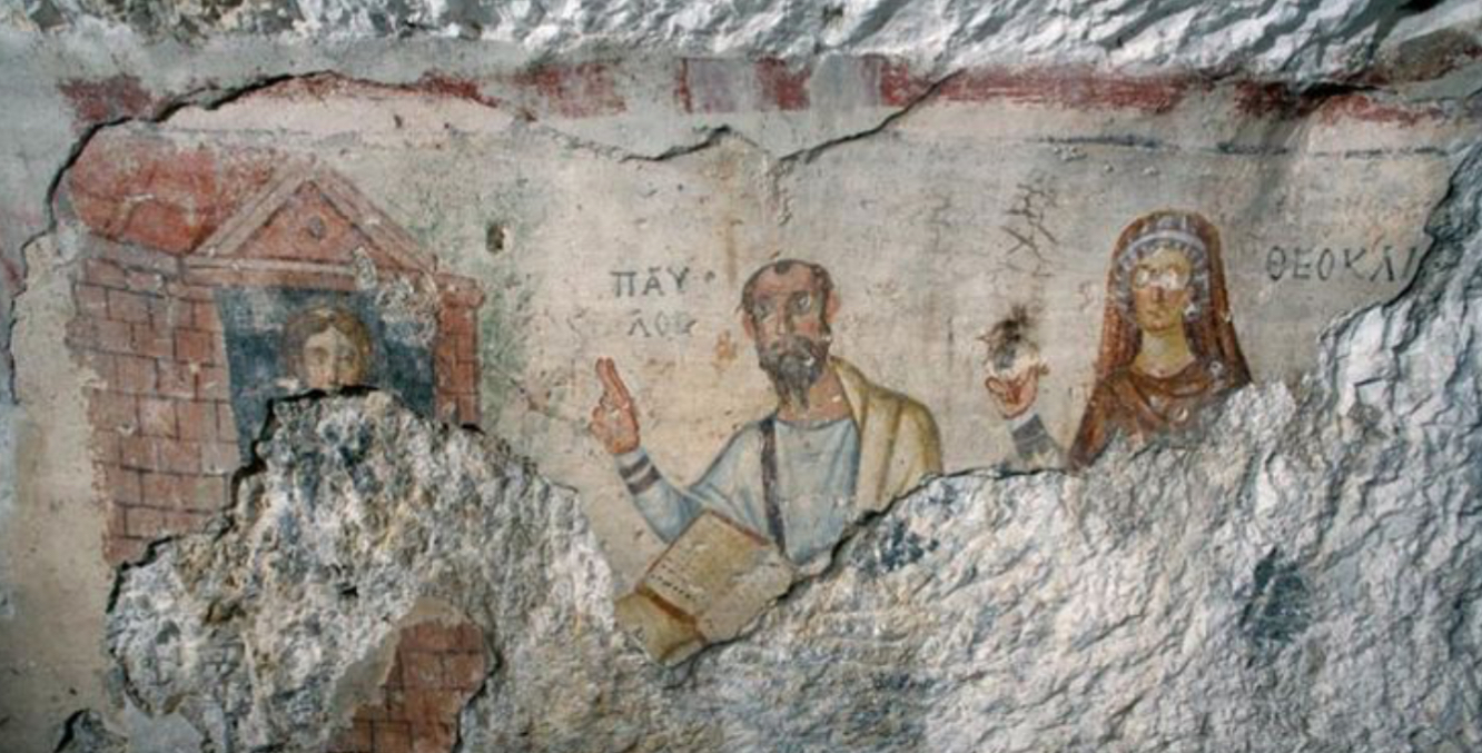 Pavlus ve Tekla’nın İşleri adındaki apokrif belgede anlatılan hikayenin başlangıcında anahtar konu, genç bir kadının duyduğu çağrıdır. Pavlus, Konya’da Onesiforo’nın evinde vaaz vermektedir. Tamiris adında genç bir delikanlı ile nişanlı olan Tekla’nın evden dışarı çıkması yasaktır. O da Pavlus’un öğrettiklerini evinin penceresinden özellikle kadınların iffeti ve bekâretihakkındaki konuşmasını dinler. Tekla içindeki alevle evlilik yolunda ayrılır ve annesine karşı çıkarak Pavlus’u izlemeye başlar. Pavlus’un öğrencisi olmakla kalmaz Küçük Asya’nın müjdecisi olur ve ilk şehit olarak kendisine burada büyük saygı gösterilir. Onun şehitliğine duyulan saygı doğuda da batıda da hızla yayılır. Milano’da şehrin en eski kiliselerinden biri olan Basilica Maior’da İmparator Kostantin’in fermanından hemen sonra 350 yılında inşa edilmiştir.